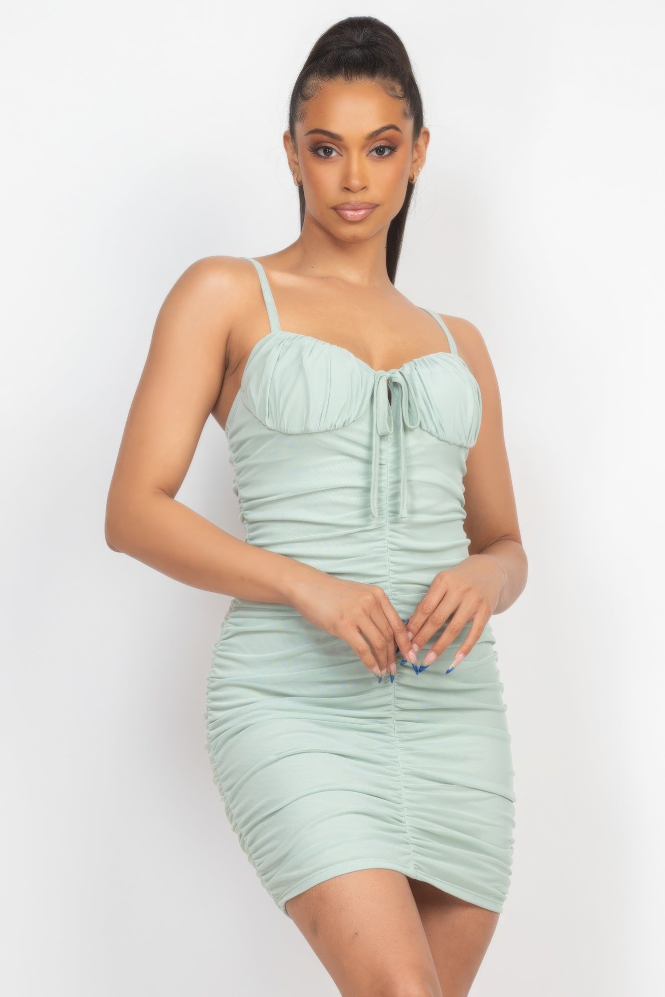 - "Absolutely adore my Front Ruched Mini Dress! The fit is amazing, and the drawstring neckline adds a unique touch. - E.W."