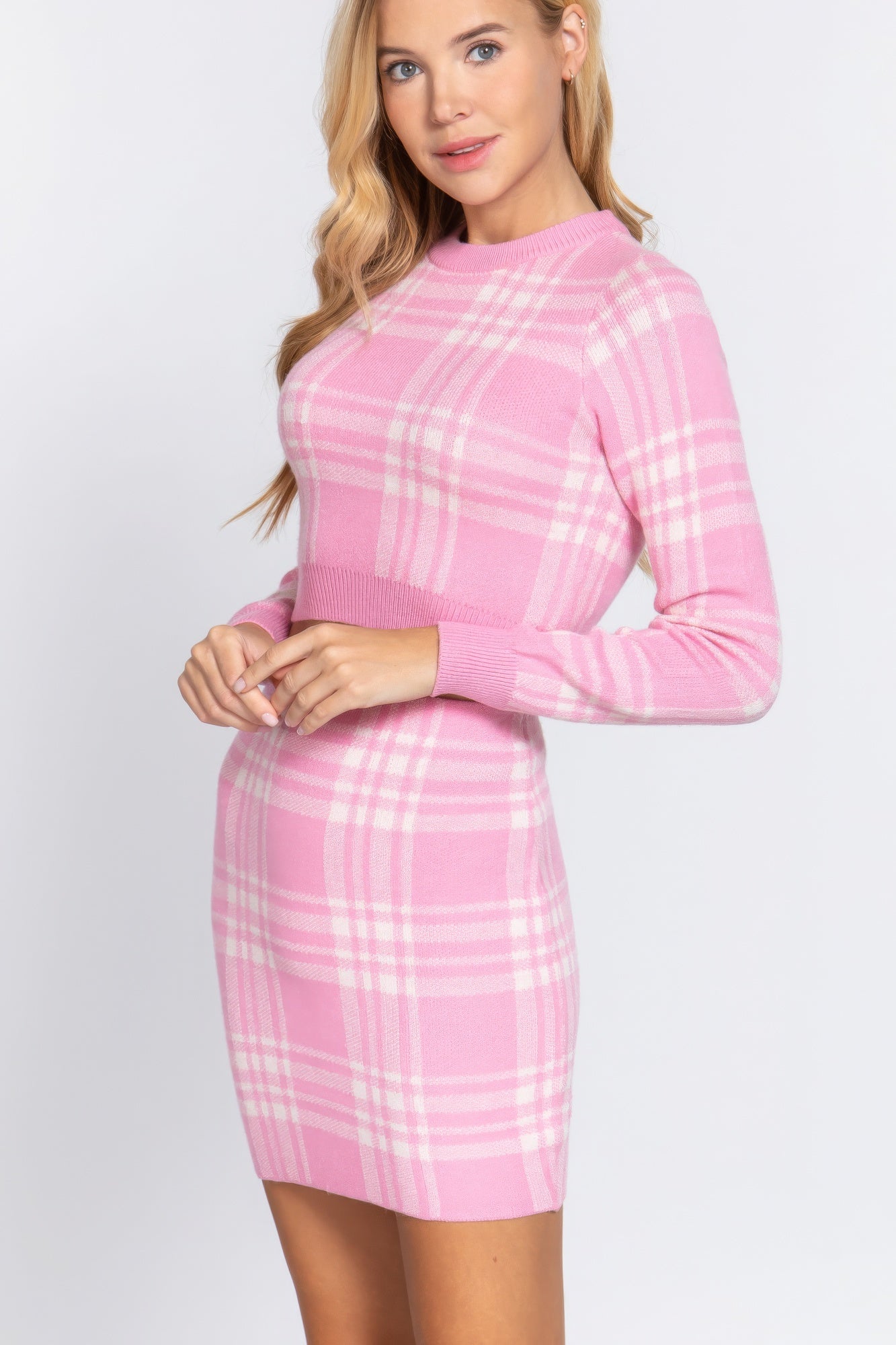 Introducing our Check Jacquard Sweater Mini Skirt in Pink/Ivory, a playful and stylish addition to your wardrobe that effortlessly combines comfort with chic design.