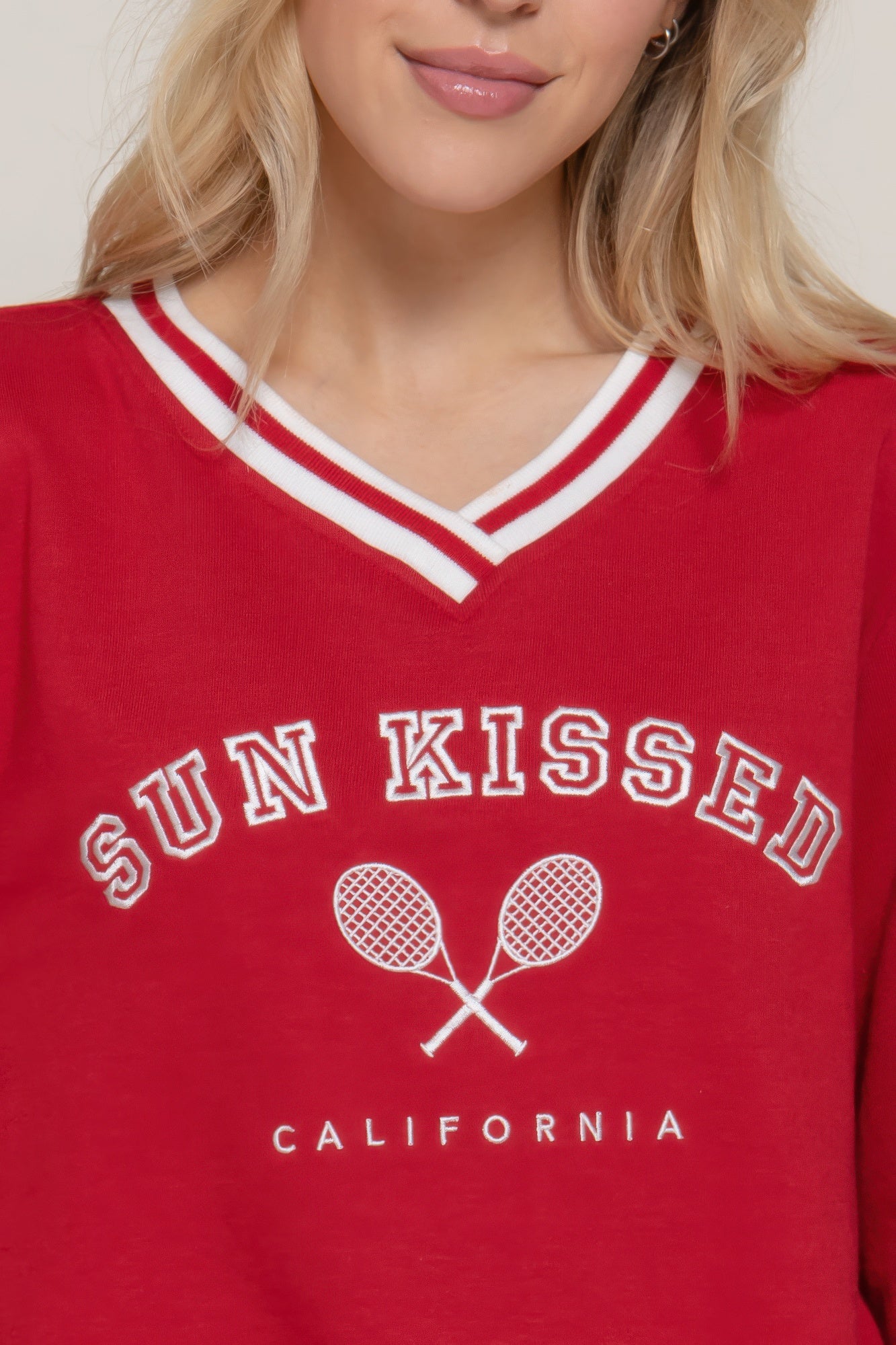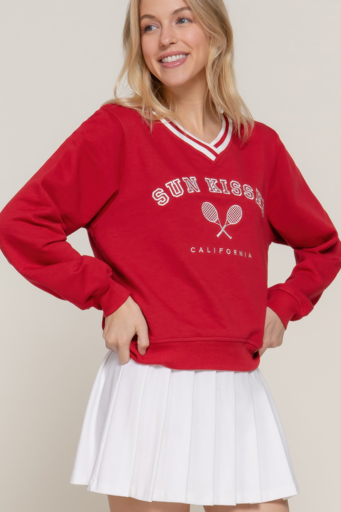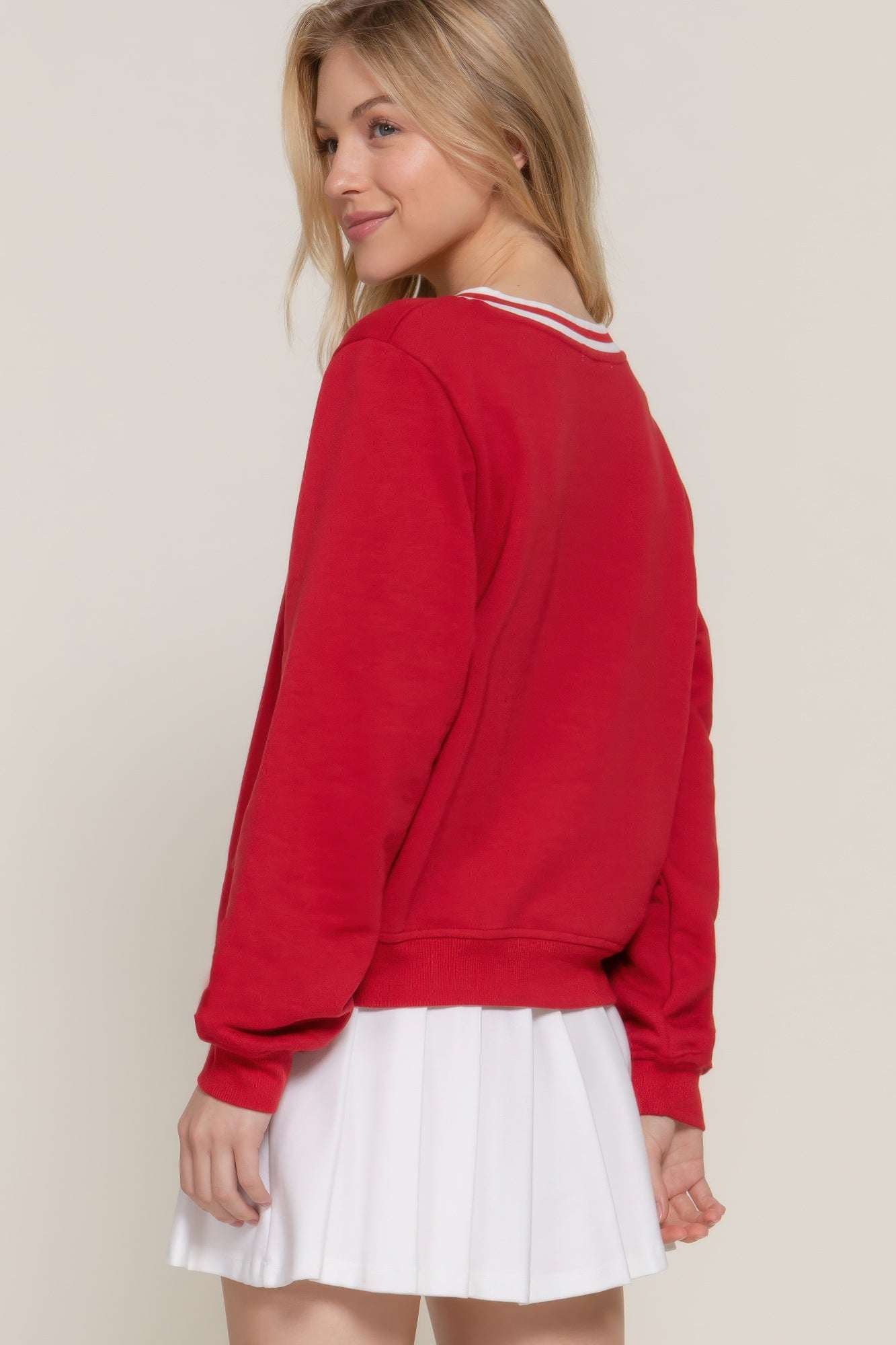 Add the Long Sleeve V-neck Embroidered Sweatshirt in Cherry Red/Off White to your cart today and enjoy a stylish, comfortable addition to your casual wardrobe!