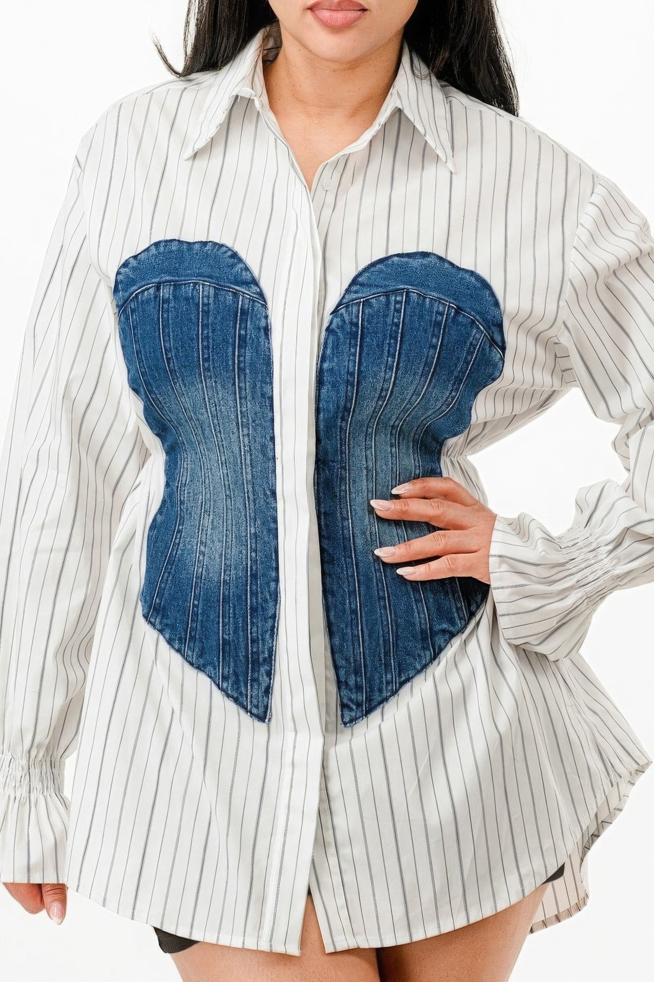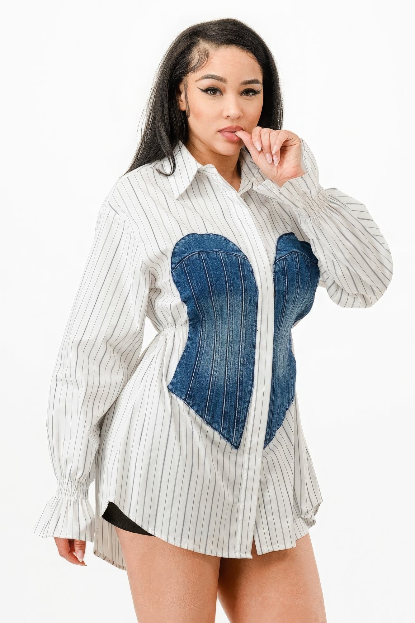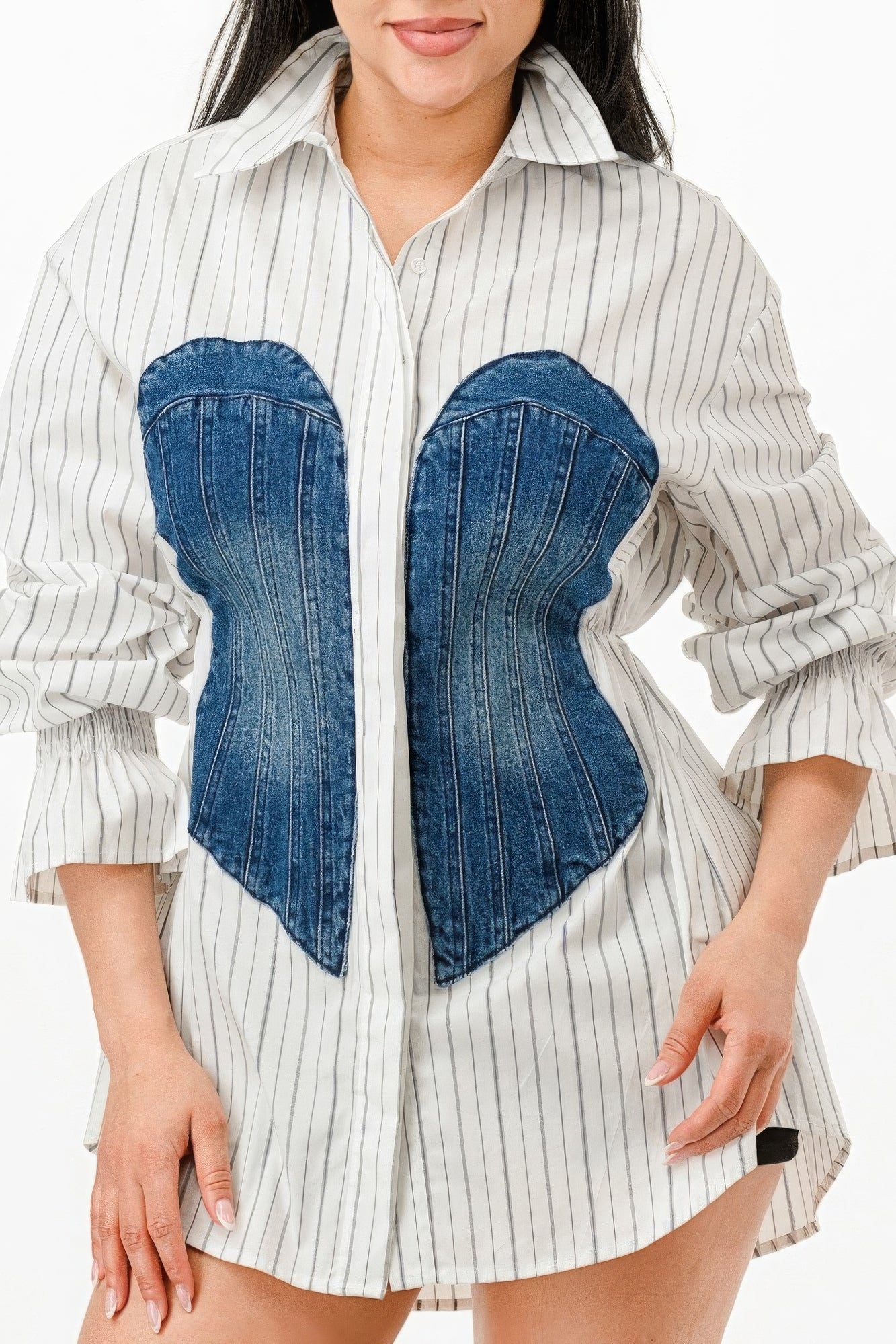 Key Features: Fabric: Made from a blend of 65% cotton, 32% nylon, and 3% spandex, this tunic offers a soft, breathable feel with a slight stretch for added comfort. Fit: Features a relaxed fit that drapes beautifully over the body, flattering all body types while allowing ease of movement. Color Options: Available in classic white and denim, perfect for versatile styling. Sizes: Offered in a range of sizes from S to L, ensuring a perfect fit for everyone. Design: Detailed with subtle stitching and a streamlined silhouette, the tunic includes elegant button accents and side slits for added flair and functionality. Versatile Styling: Easily dress it up with tailored pants for a formal look, or pair it with leggings or jeans for a casual, laid-back vibe.