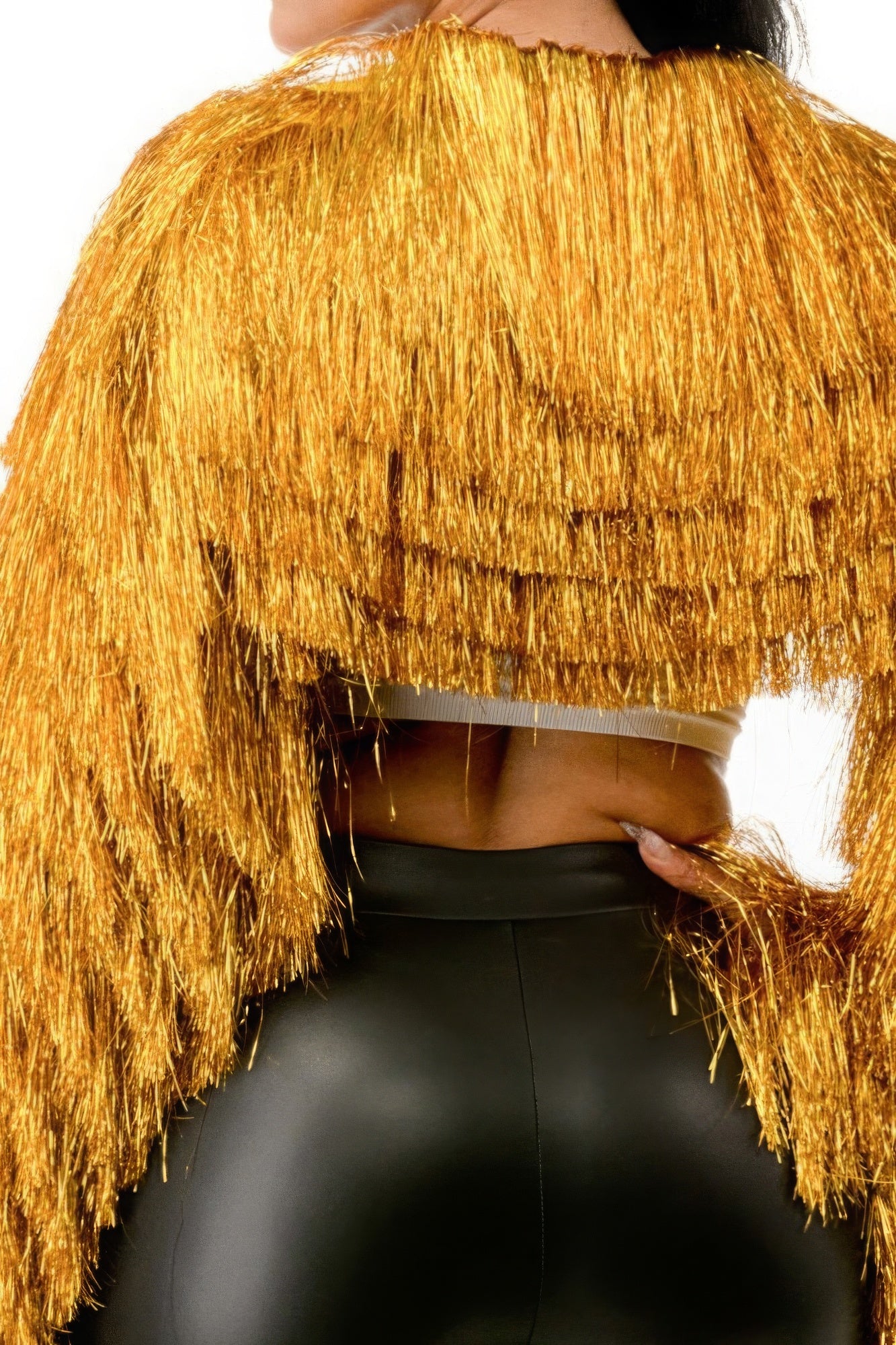 Customer Reviews: 1. "Absolutely love the metallic shine! The fringy details add such a playful touch." - S. H. 2. "Versatile and stunning! I can wear it open for a casual look or closed for a night out." - M. K. 3. "The gold color is so vibrant and beautiful. I always get compliments when I wear this bolero!" - A. R.