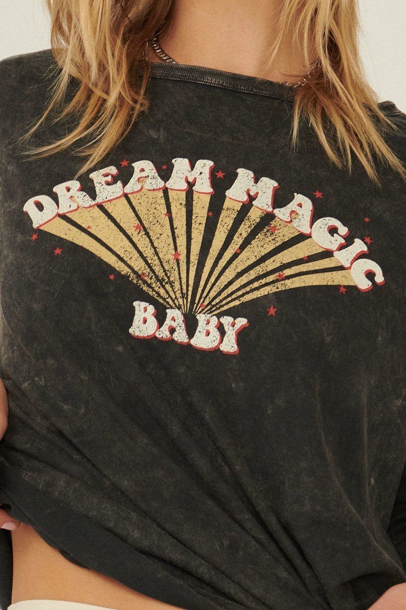 Why Choose Mineral Washed Dream Magic Baby Top? Embrace the vintage-inspired design, Dream Magic Baby text print, and stars graphic, making this top a playful and unique addition to your collection.